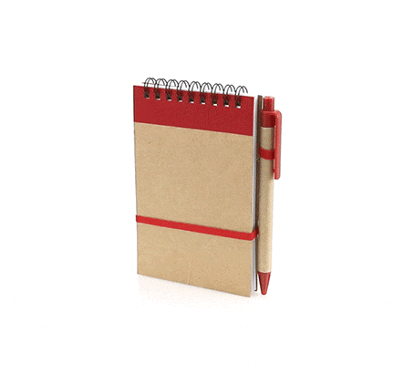 Établir un devisBloc-notes à spirale publicitaire écoresponsable avec couverture carton et papier recyclé. Bloc d’environ 70 feuilles lignées/140 pages et un stylo-bille recyclé écriture bleue. Couverture cartonnée brute avec ruban élastique de couleur.